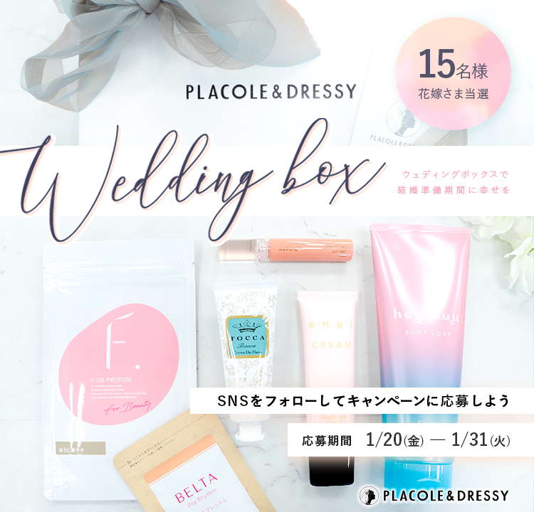 「PLACOLE & DRESSY」ブランドを展開する、冒険社プラコレ(本社:神奈川県鎌倉市、代表取締役CEO:武藤功樹)は、花嫁の結婚準備期間に幸せを届ける Wedding Box -ウェディングボックス-を制作、1月限定ボックスを15名へのプレゼントを決定致しました。