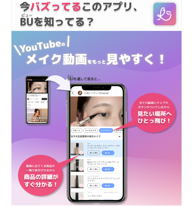 早稲田大学の学生ベンチャー企業・株式会社Cinderelax(本社:東京都新宿区、CEO:小池伶佳)は、学生にまで広がるメイク市場のニーズをとらえ、この度YouTube内のメイク動画を圧倒的に見やすくするアプリ「BU(ビュー)」をリリースいたしました。