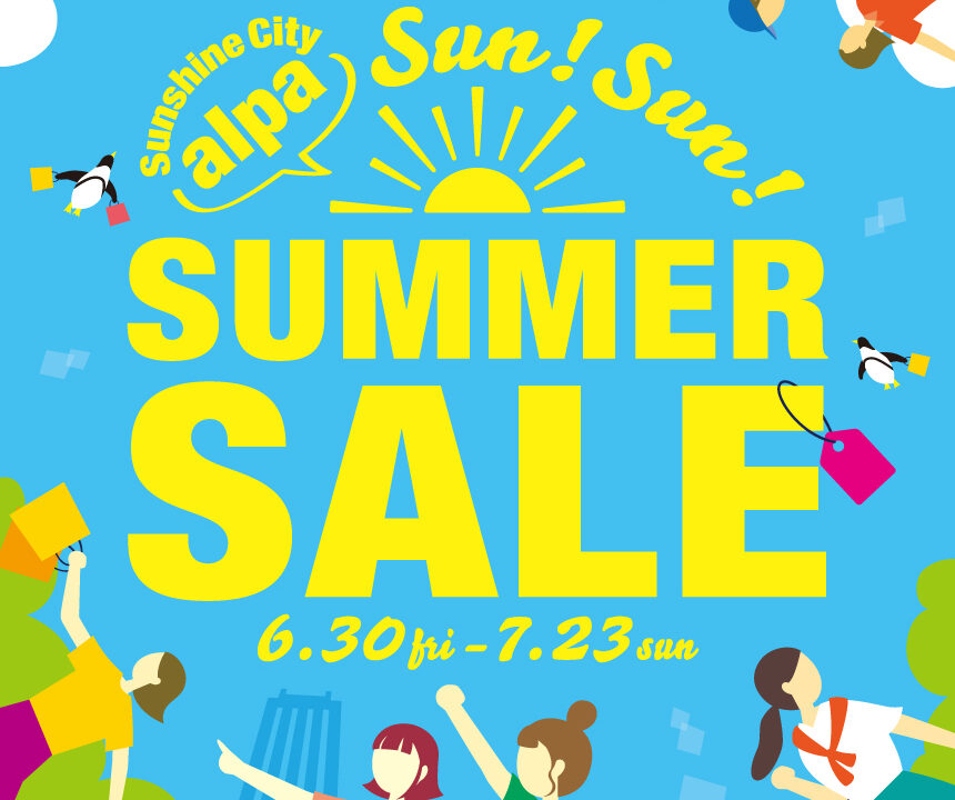 サンシャインシティ(東京・池袋)専門店街アルパでは、6月30日(金)~7月23日(日)の期間、対象商品が最大80%OFFとなる半期に1度のセール「SUN!SUN!SUMMER SALE」を開催します。さらに、セール開始からの3日間【6月30日(日)~ 7月2日(日)】は、専門店街アルパの対象店舗にてサンシャインシティカードをご利用いただくと、引き落とし時に会計金額から10%OFFになる「サンシャインシティカード10%OFF」を実施し、セール価格からさらにお得にお買い物ができます。