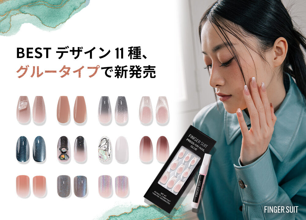 韓国発のネイルチップブランドFINGER SUIT(フィンガースーツ)の公式通販サイトで、BESTデザイン11種がグルータイプで新発売します。フィンガースーツはチップの裏面に粘着剤が付いている一体型ネイルをメインとしており、一部のデザインのみグルーが付属されたグルータイプネイルチップまでラインナップされています。お客様からの暖かいご声援に支えられ、マグネット、シロップ、パーツをはじめとするベストデザインをグルータイプで新たに公開しラインナップを拡大することができました。発売記念として、グルータイプの新作を対象に2週間10%OFFプロモーションを行いますので、是非お見逃しなくチェックしてみてください。