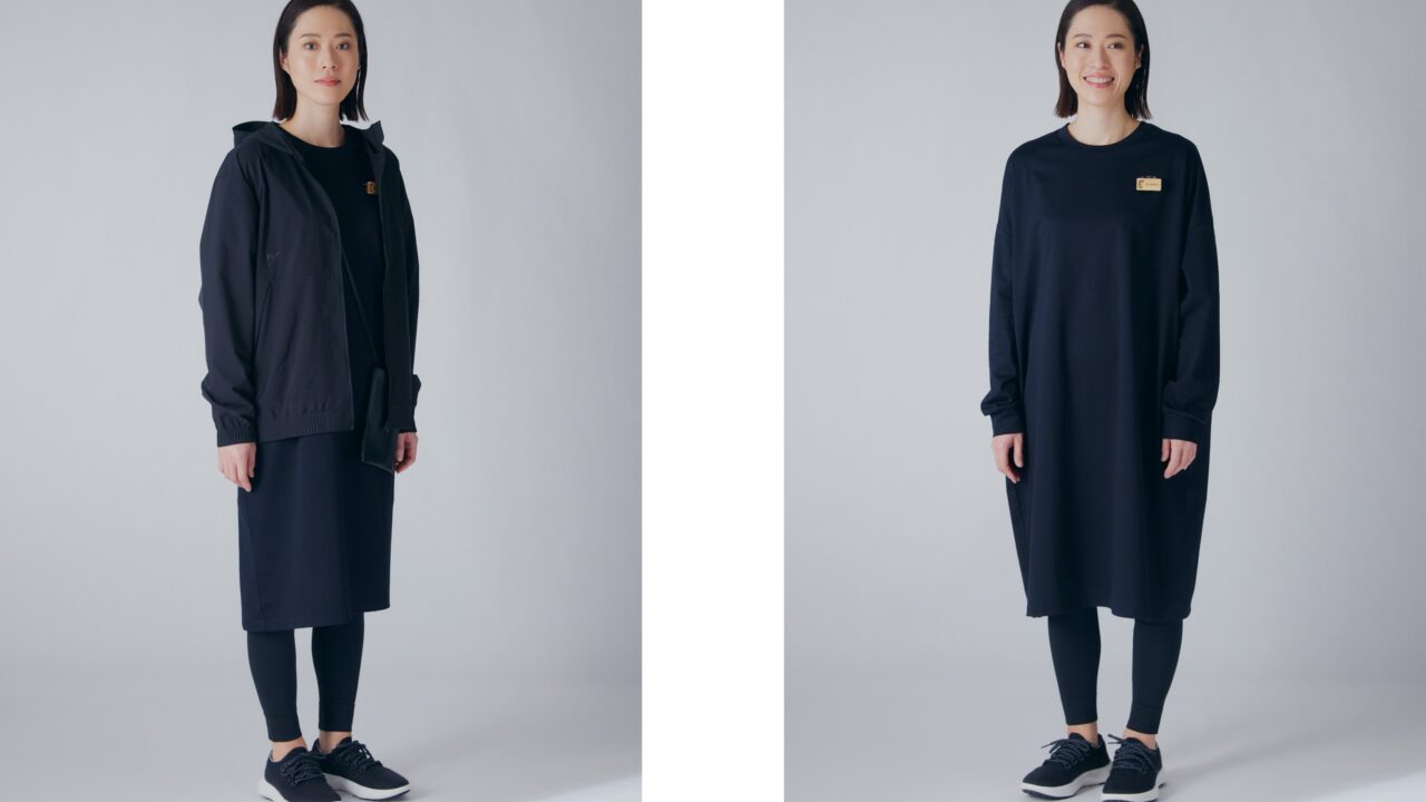 春夏はワンピースにレギンス、秋冬はフード付きのジャケットを重ねます。足元はスニーカー。アクティブライフを応援するブランドコンセプトを反映して、動きやすい機能性も重視し、すべて環境配慮型素材を用いたものを採用しました。