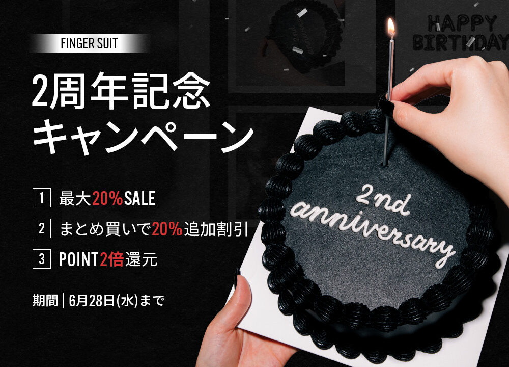 韓国発ネイルチップブランドFINGER SUITではローンチ2周年を迎え、6月28日(水)まで日本公式サイトで3つの特典で構成された超豪華イベントを実施します。 人気商品やケア商品の最大20%OFFから、まとめ買いでさらに20%OFF、ポイント還元率2倍まで。日本のオフライン店舗で成功裏に販売開始しただけに、感謝の気持ちを込めたさまざまな特典がご用意されています。