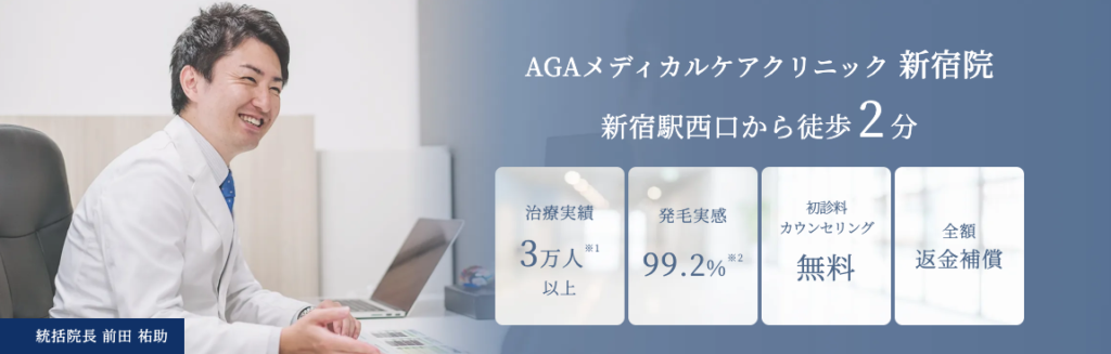 AGAメディカルケアクリニックは、薄毛専門・発毛・抜け毛予防治療を専門に取り扱うAGA専門のクリニックです。特に20代〜30代の若い世代に支持されているのが特徴で、レビューでも高評価の声が多く見られました。